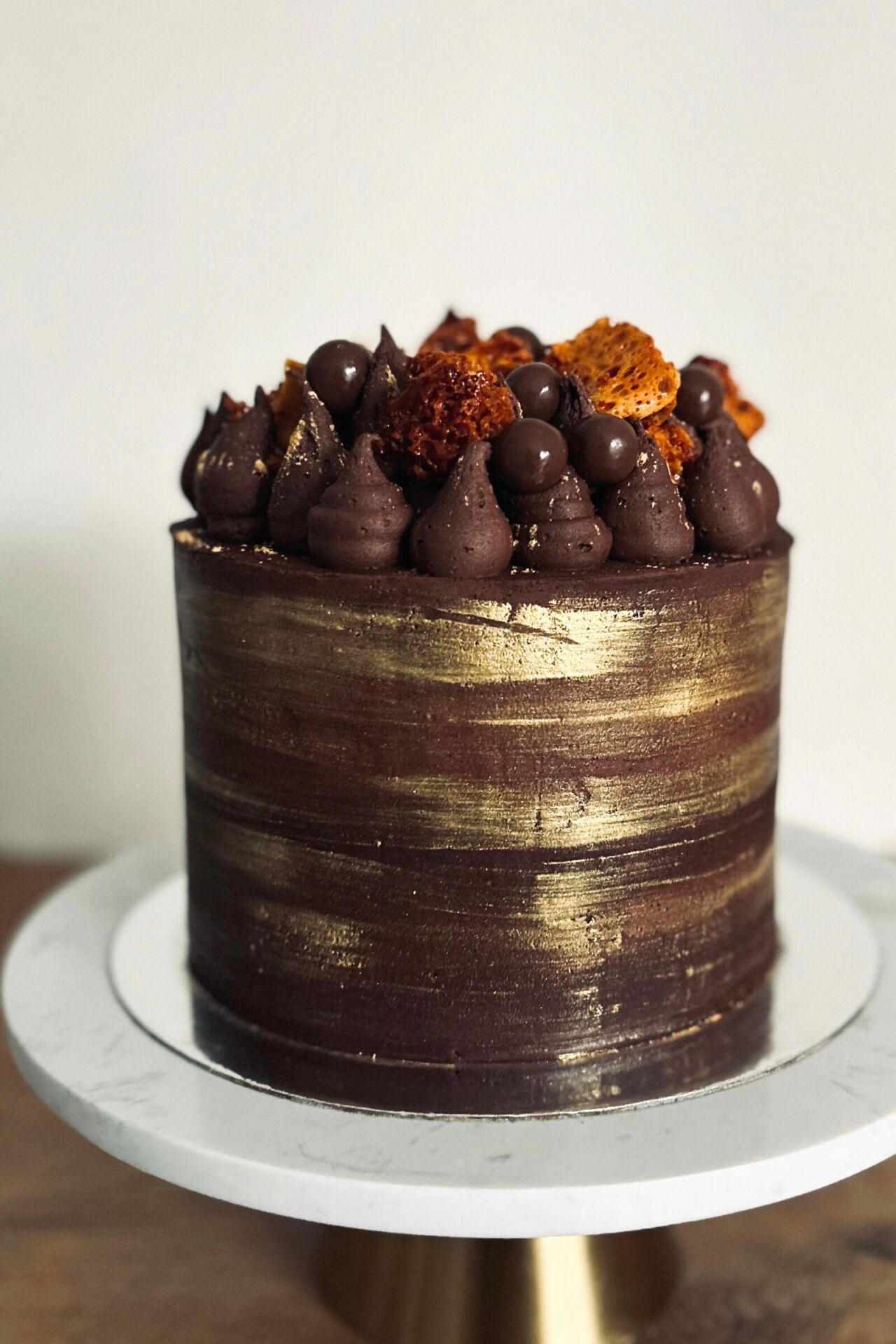A chocolate filled cake topped with chocolate whispers and gold accents. Yes. Please.